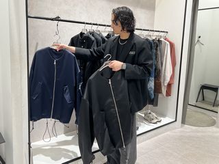 モードとストリートのミックスコーデを提案。